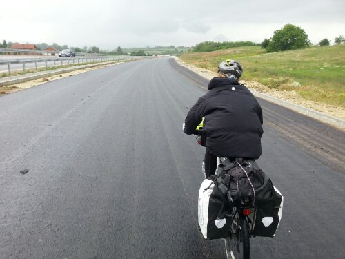 A quick break in the clouds and we set off, immediately taking the wrong road. Moral was low. Eventually we found the road but it turned into autobahn but rather than admit defeat we cycled past the road crew and onto the freshly paved autobahn which was only waiting for it’s grippy top layer. It was as smooth as glass and just for us, bliss! This continued almost to our destination, Bujanovac where for a short time we were on a horrible busy 2 lane road, the clouds really opened up and Kathi shed a tear or two. We knew we were close and pushed onto arrive at Bujanovac in torrential rain. 17km in 55 minutes!! Our best yet and from thinking we wouldn’t make it we now even had time for coffee and some food.