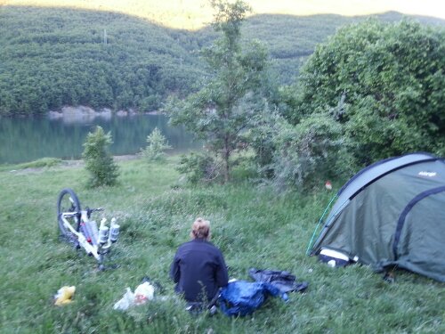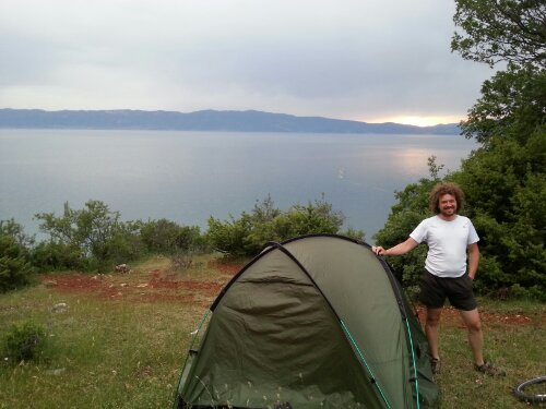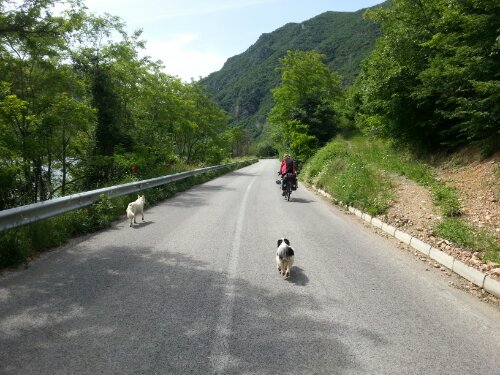 The second night we were just about to go to sleep and two playful stray dogs came bounding up, they stayed outside the tent all night and the next day one of them followed us for 40km into Struga. The dog easily managed 14kph but struggled if we went faster so the journey took a while. On the way we found three more tiny stray puppies at a bus stop. It’s a shame you can’t help them all.