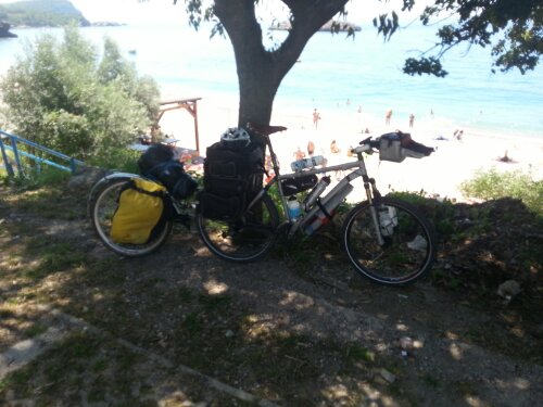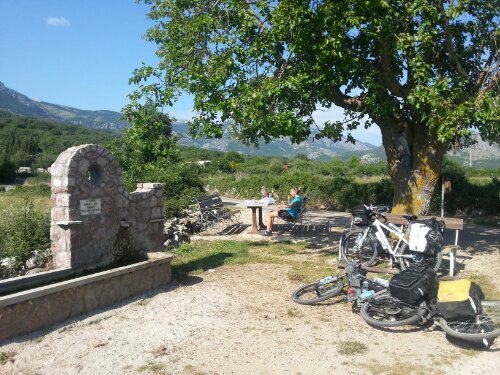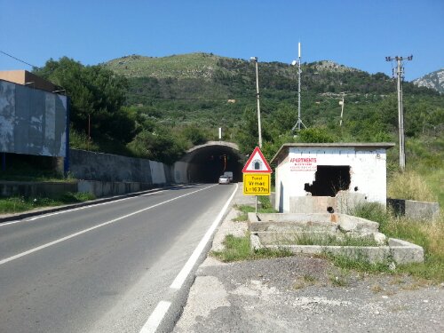 The rest of the ride was fairly uneventful,  my antibiotics made for an even harsher-feeling sun, we passed a tunnel that was about 1700m long, I saw a run-over tortoise and a run-over badger (it may have been somethig else) and I realised that while the car drivers in Montenegro are extremely respectful of the space a cyclist needs, bus drivers seem to have a severe problem with us. Every time a bus passed it left us with no more than 20cm on the side. I was overtaken by one bus in particular that trapped me toward the cliff wall with only about 10 cm between us so I was literally stuck between a rock and a hard place. Mike didn’t like me getting scared and breaking at that instant either as he was only 20cm behind me and also had to break.