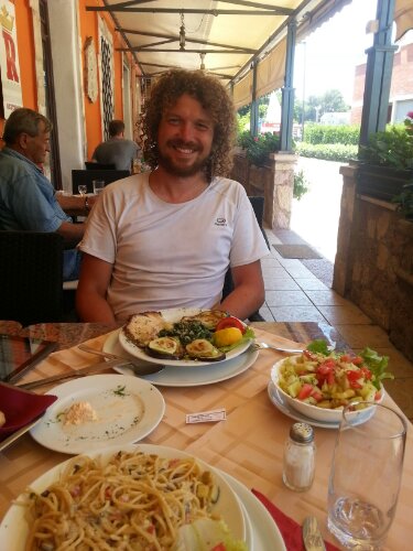 After an hour and a half we found a lovely beach that we went to cool off in the sea for and then had breakfast (22 € for a big bottle of water, two salads, the best pasta I’ve probably ever had and a three-course fish based meal. If that’s not cheap, I don’t know what is.)